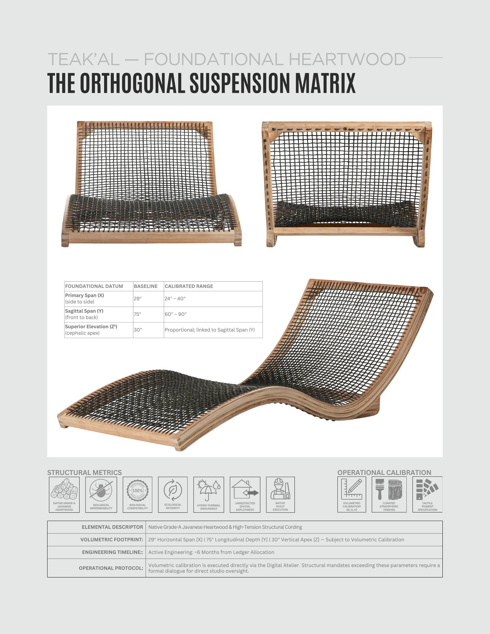 Trapped within the squared perimeter is the High-Tension Suspension Plane. Executed in a permeable functional surface (Batyline® or Polyethylene Cording), this yielding plane eradicates the need for perishable textiles. It provides unyielding ergonomic support while allowing for absolute aerodynamic flow and immediate liquid displacement.