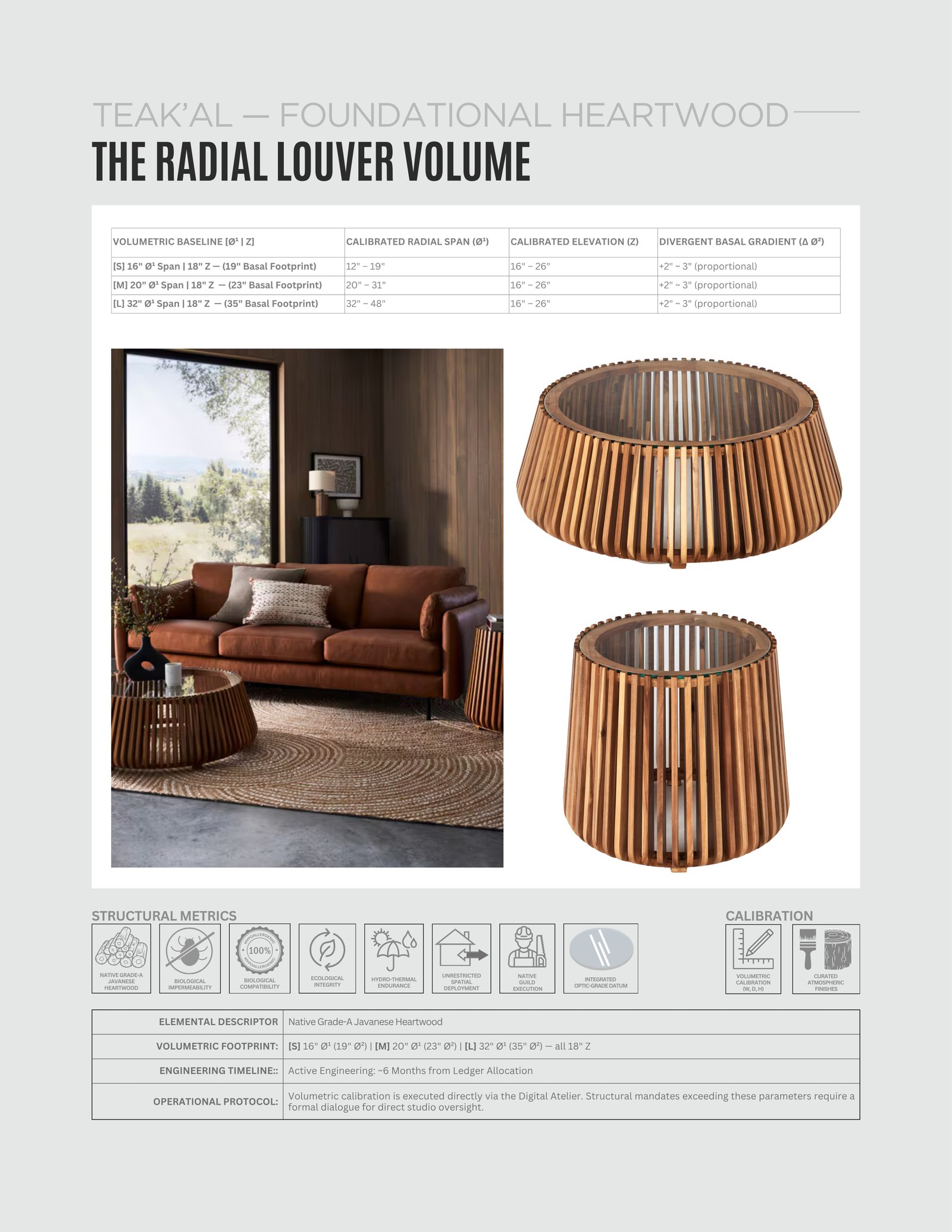 The Radial Louver Volume is a definitive study in radial geometry and visual permeability. This volume abandons solid structural mass in favor of a highly calibrated louver system, merging the absolute density of Native Grade-A Javanese Heartwood with a transparent, functional datum.