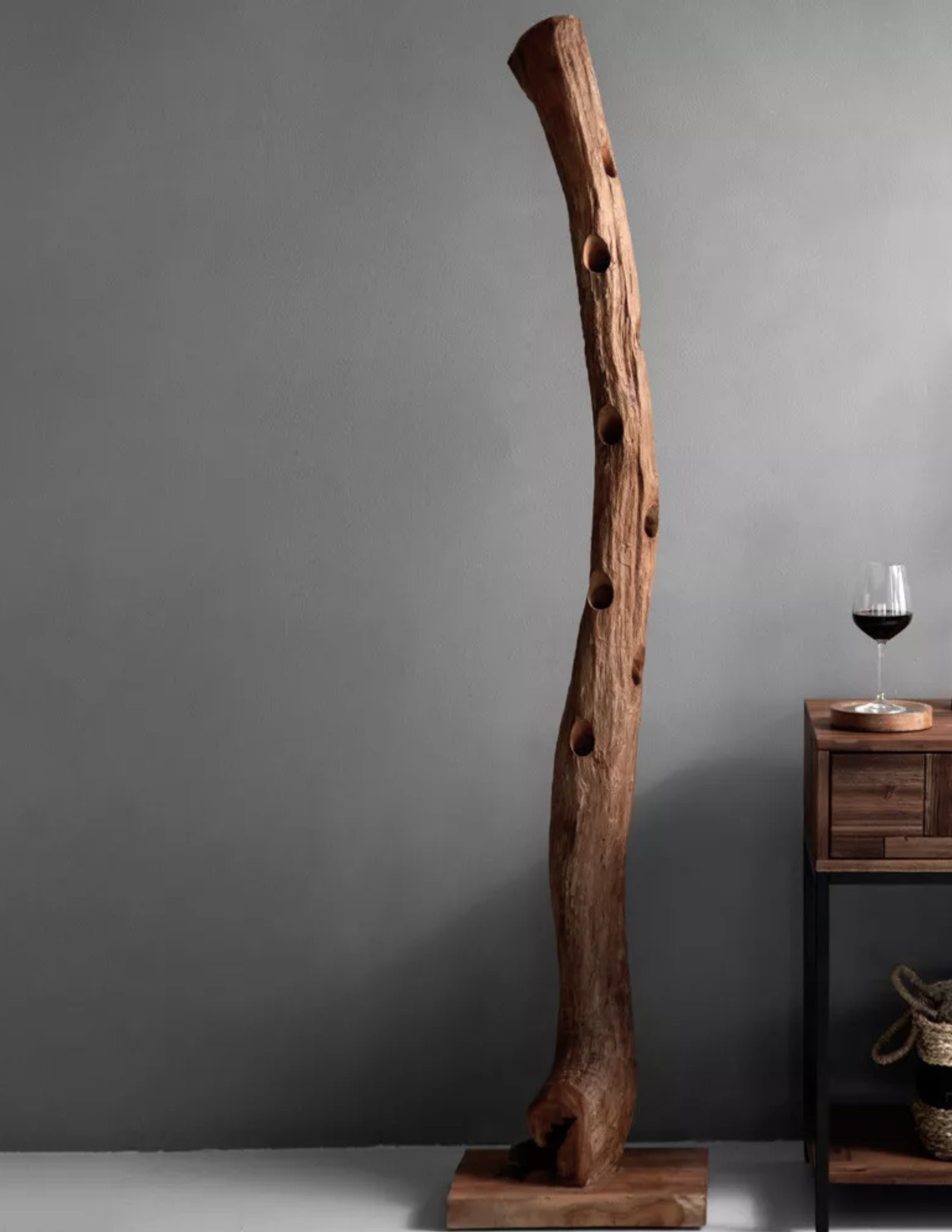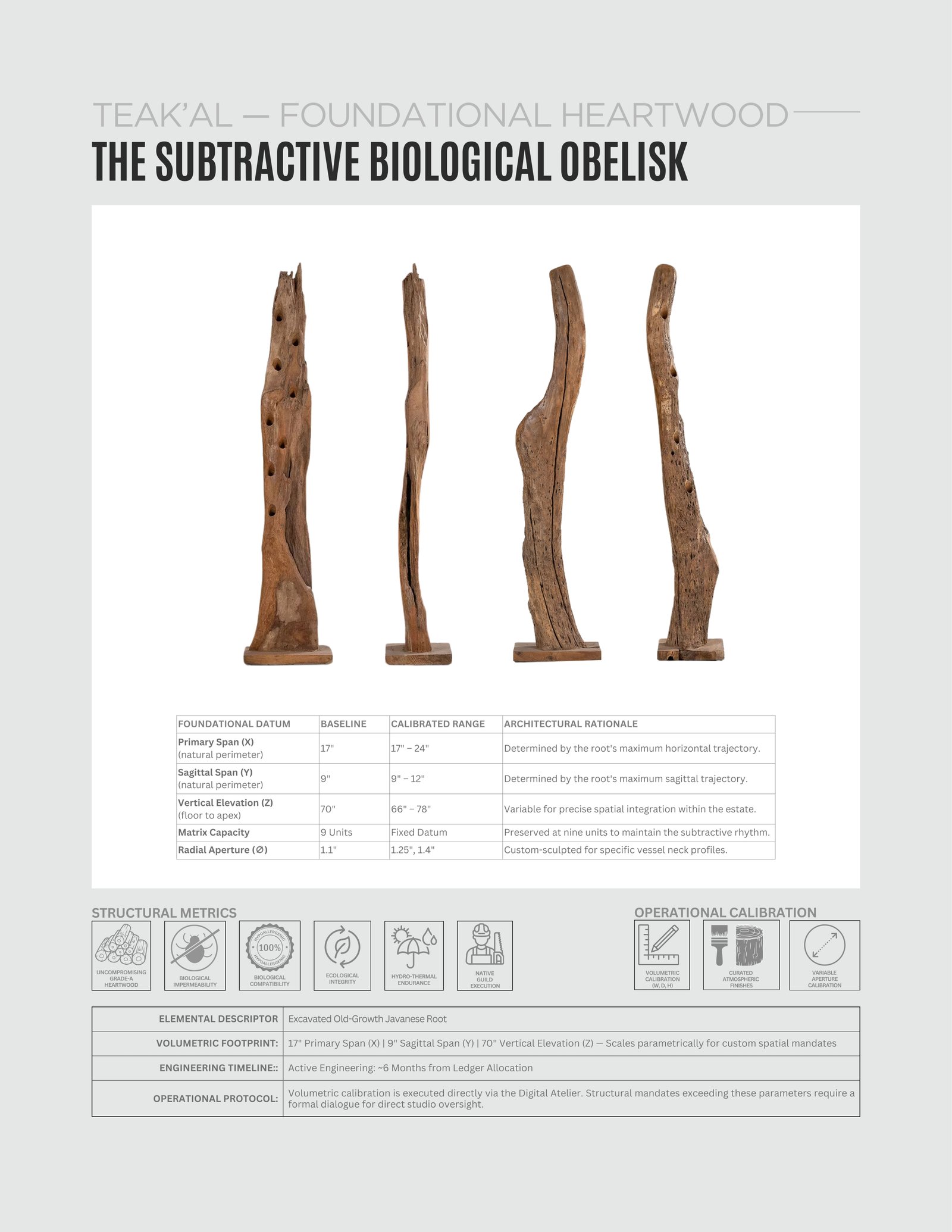 The primary structural presence is dictated by the unique, non-repeating trajectory of a singular teak root. Every crevice, knot, and fissure is preserved as a topographical archive of the timber’s environmental history. This massive organic column is anchored to a heavy, orthogonal heartwood base, establishing absolute lateral stability for high-value cellar archives.